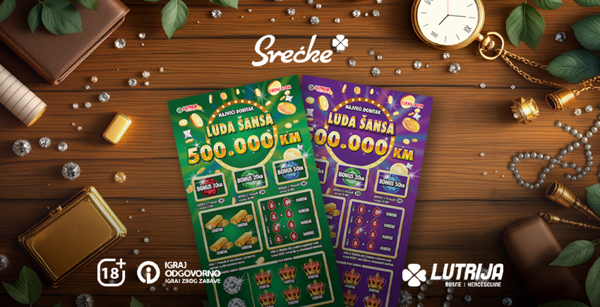 LUDA ŠANSA je nova srećka Lutrije BiH koja nudi mogućnost ostvarivanja najvećeg JACKPOTA u iznosu od 500.000 KM.