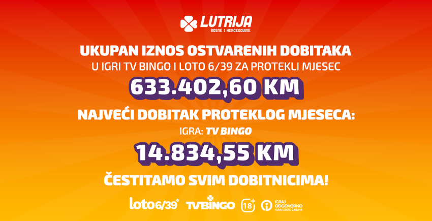 Sreća je i ovog puta bila na strani onih koji nisu odustali! Tokom mjeseca septembra igrači Lutrije Bosne i Hercegovine još jednom su dokazali da upornost i vjera u sreću donose sjajne rezultate. U igrama TV Bingo i Loto 6/39 isplaćeno je više od 633.000 KM dobitaka!
