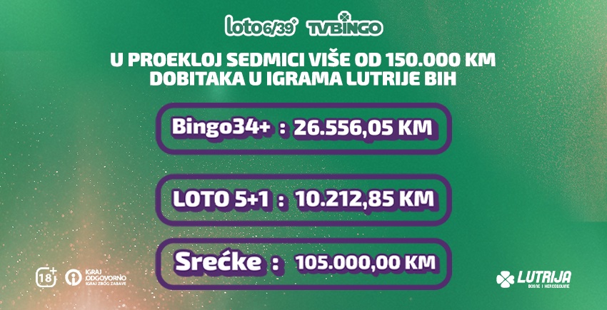 Igre Lutrije Bosne i Hercegovine i u protekloj sedmici donijele su značajne dobitke i razloge za zadovoljstvo igračima širom zemlje. U igrama Loto 6/39, Srećke i TV Bingo, ostvareni su ukupni dobitci u iznosu od 150.770,90 KM, čime je još jednom potvrđeno povjerenje i interesovanje koje ove igre imaju među igračima.